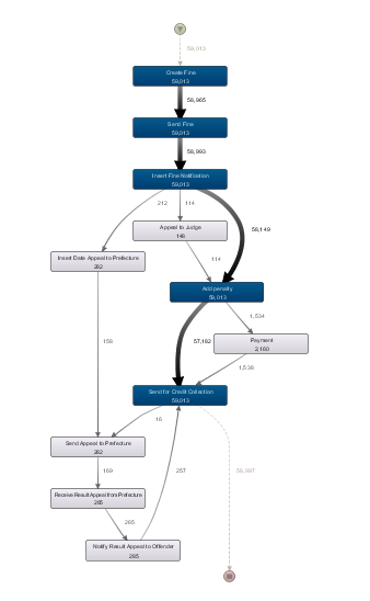 Process Discovery는 프로세스 마이닝에서 가장 중요한 분야로서, 아무런 사전 정보 없이 이벤트 로그로부터 모델을 도출하는 것을 의미한다. 여기서 가장 중요한 것은 아무런 사전 정보 없이이다. 그저 어떤 시스템으로부터 도출되어 저장된 데이터를 이벤트 로그 형태로 가공만 하면, 이로부터 바로 프로세스가 어떻게 흘러갔는지를 이해할 수 있는 것이다. 한 눈에 쉽게 이해할 수 없는 표 혹은 로그 형태로 저장된 데이터를 아래 그림처럼 흐름을 한 눈에 볼 수 있는 형태로 한 번에 바꾸어 준다는 것은 굉장히 놀라운 일이다.