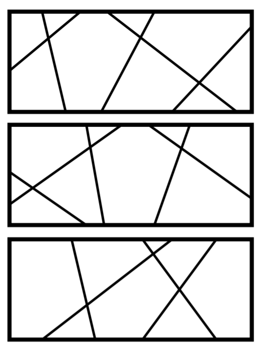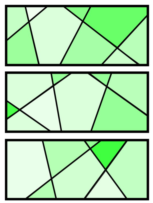 우리는 이 세 개의 스테인드 글라스의 각 칸에 대해 다음과 같이 각각 원하는 색의 진하기로 색을 칠할 것이다.