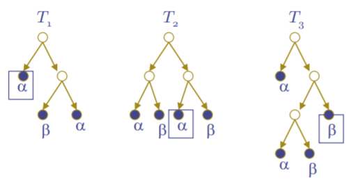 이제 1과 2에서 도출해 낸 tree들의 결과를 합해 Forest를 만들 차례이다. 이에는 기본적으로 voting을 사용한다. (다른 방법도 가능하다.) 즉, 같은 데이터를 위에서 도출한 decision tree들에 넣었을 때, 가장 많은 표를 받은 결과값을 우리의 random forest의 결과값으로 채택하는 것이다. 예를 들어, 다음과 같은 세 개의 decision tree가 있다고 하자.