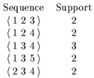이 L_3으로 부터 얻은 C_4는 <1 2 3 4>, <1 2 4 3>, <1 3 4 5>, <1 3 5 4>가 된다. 이 중 minimum support를 만족하는 sequence는 <1 2 3 4>이다. 이것이 L_4가 된다.