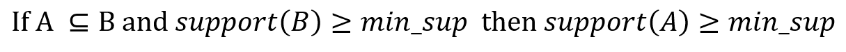 그러므로 B의 support가 우리가 설정해 놓은 minimum support 값보다 크다면, A의 support 또한 minimum support 값보다 클 것이다. 이를 식으로 표현하면 다음과 같다.