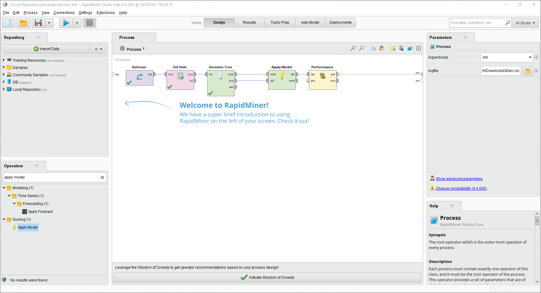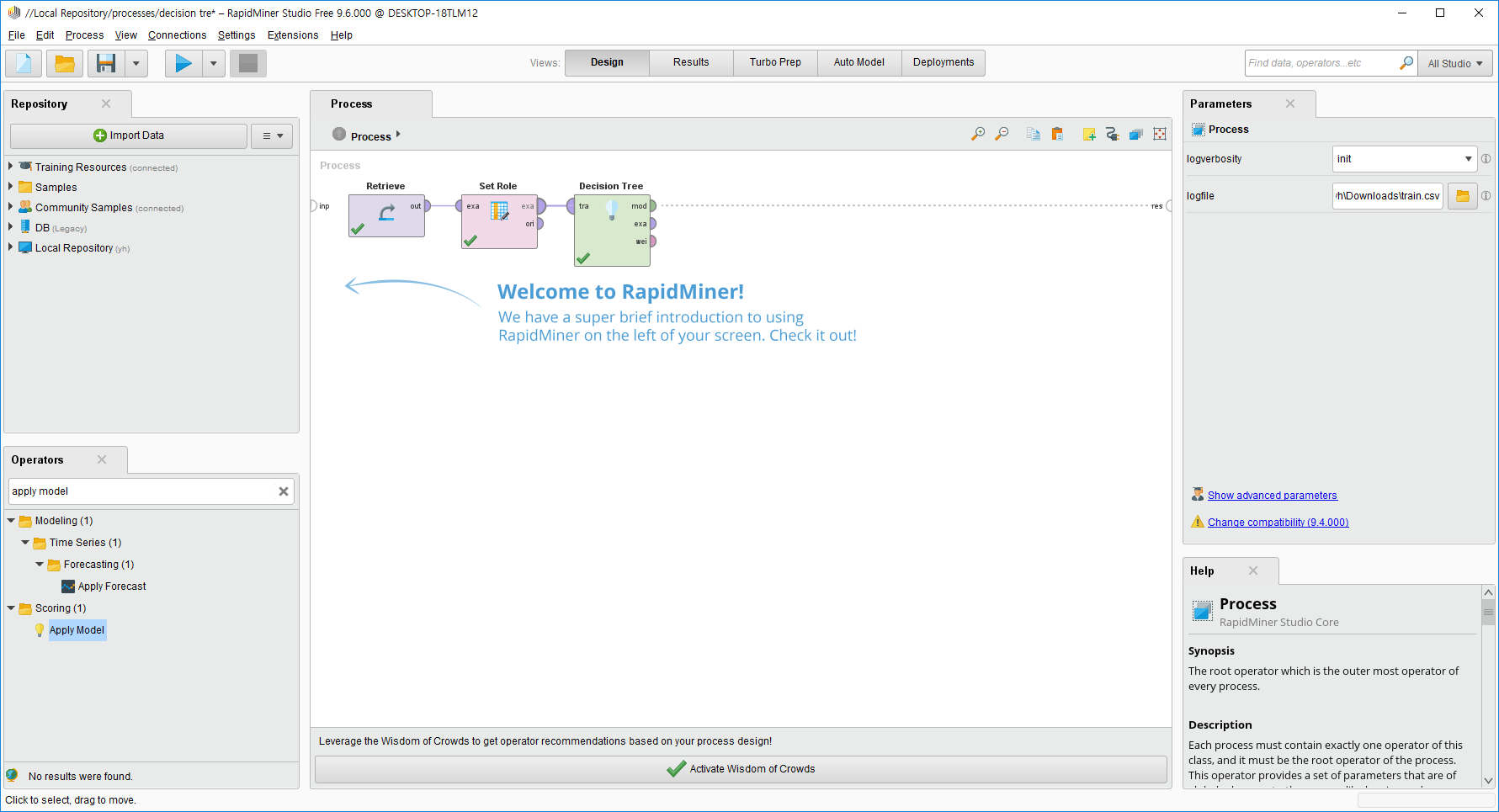 모델의 classification 성능을 분석하려면, 우선 성능을 분석할 대상이 되는 모델이 있어야할 것이다. 그러므로 Classification model을 준비한다. (이 포스팅에서는 저번 RapidMiner로 Decision Tree 분석하기에서 사용한 decision tree 모델을 사용하도록 하겠다.)
