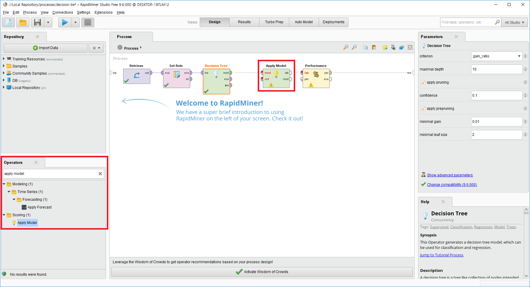 모델의 classification 성능을 분석하려면, 우선 성능을 분석할 대상이 되는 모델이 있어야할 것이다. 그러므로 Classification model을 준비한다. (이 포스팅에서는 저번 RapidMiner로 Decision Tree 분석하기에서 사용한 decision tree 모델을 사용하도록 하겠다.)