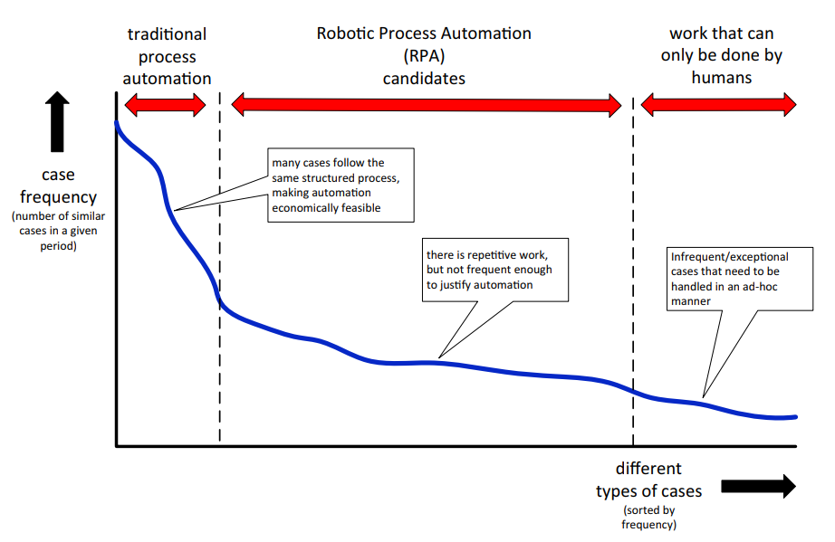 X축(가로축)은 일들이 서로 비슷한 정도를 말한다. 오른쪽으로 갈수록 일이 다르고, 왼쪽으로 갈수록 비슷하다. Y축(세로축)은 일이 일어나는 빈도를 말한다. 위로 갈수록 더 자주 일어나고, 아래로 갈수록 더 드물게 일어난다. 기존의 자동화는 가장 자주 반복되는 일들인 비슷한 일들을 자동화했고, 적게 일어나는 비슷하지 않은 일들 혹은 예외적인 일들은 사람에 의해서만 처리가 가능하다. RPA는 이 사이에 있는, 너무 자주 일어나지는 않지만 반복적인 일들을 자동화하는 것을 목표로 한다.