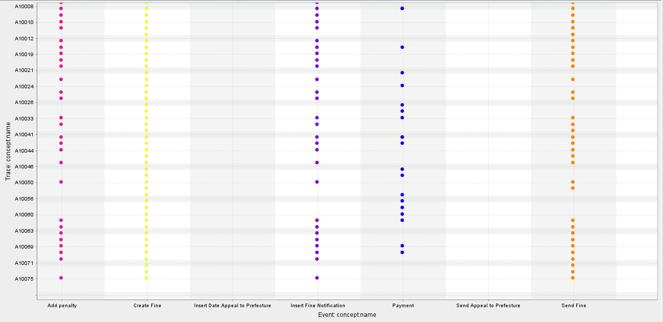 Dotted Chart는 X축, Y축을 무엇으로 정하냐에 따라 다양한 형태를 지닐 수 있다. 우선, 가장 기본적인 형태는 위에서도 보았던 X축 절대시간, Y축 trace의 형태이다. 이러한 형태는, 각 케이스 내의 이벤트들이 발생한 절대적인 시각을 봄으로써 케이스가 정확히 어떤 시각에 진행되었는지를 파악할 수 있다.