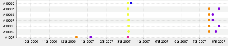 위 그래프를 보면, A10061 케이스에 점이 2007년 3월 언저리에 하나, 2007년 7월 중순경 하나, 2007년 8월 중순경 하나 찍혀 있음을 알 수 있다. 즉, A10061 케이스의 이벤트가 그렇게 3번 일어났다는 것으로 해석할 수 있다.