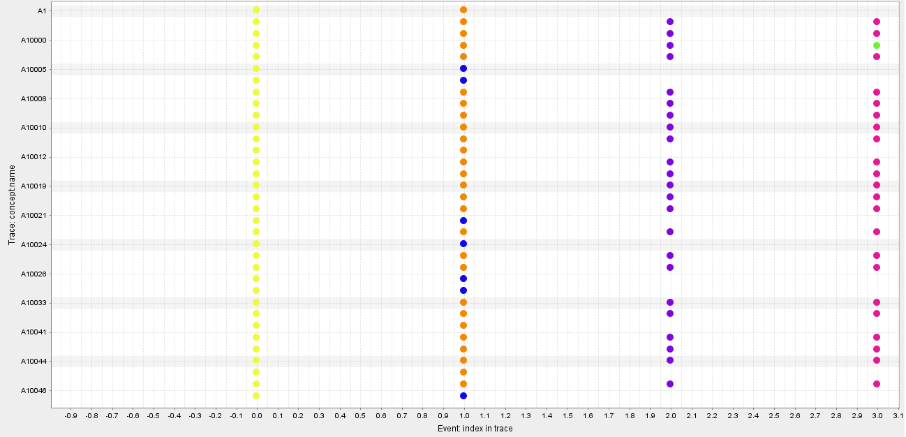 다음으로, X축을 trace 내의 이벤트 순서, Y축을 trace로 정할 수도 있다. 그러면 같은 데이터도 아래와 같은 형태가 된다. 아래와 같은 형태는, 케이스 내의 이벤트 순서를 한 눈에 파악하는 데에 도움이 된다.