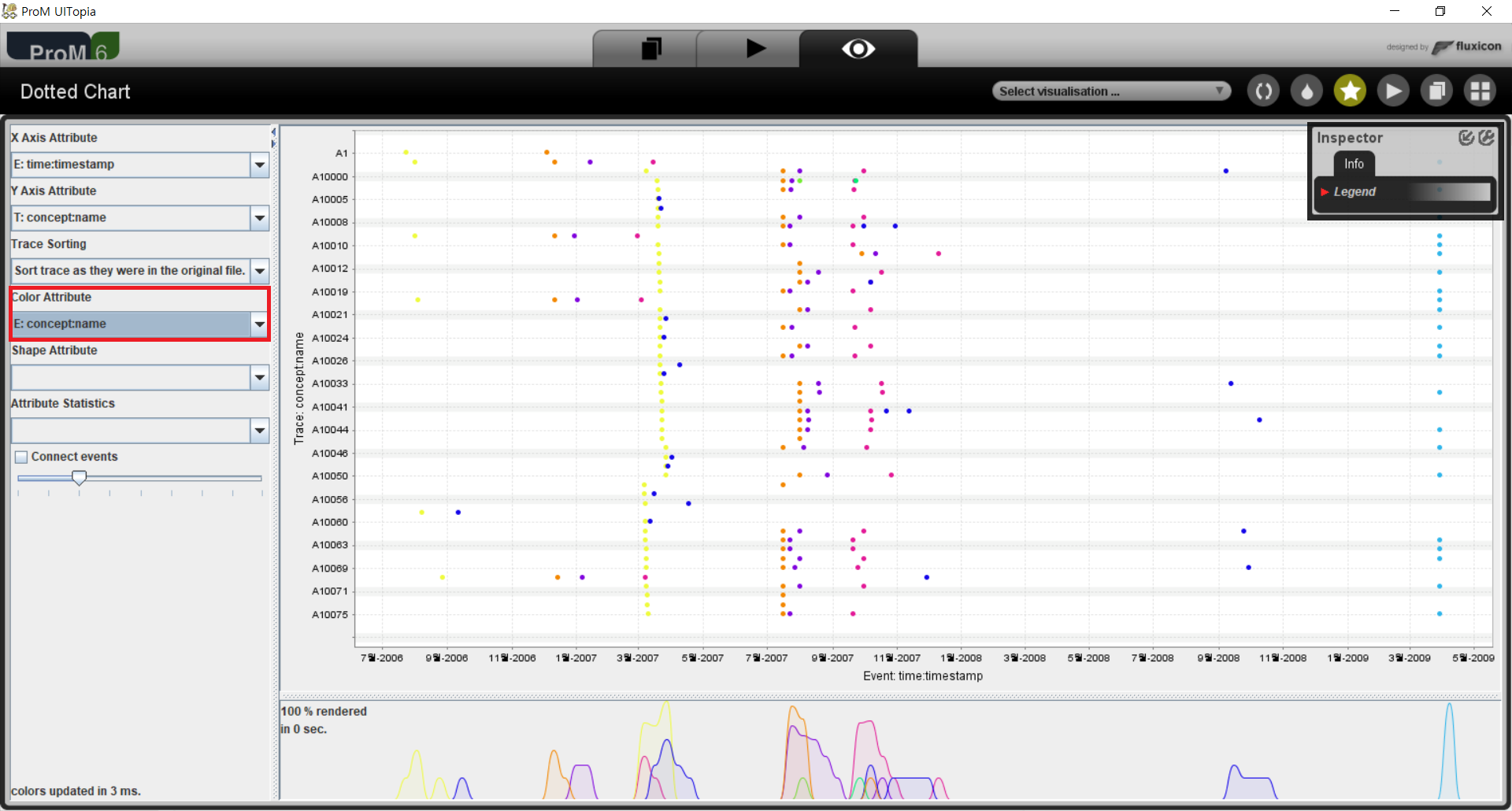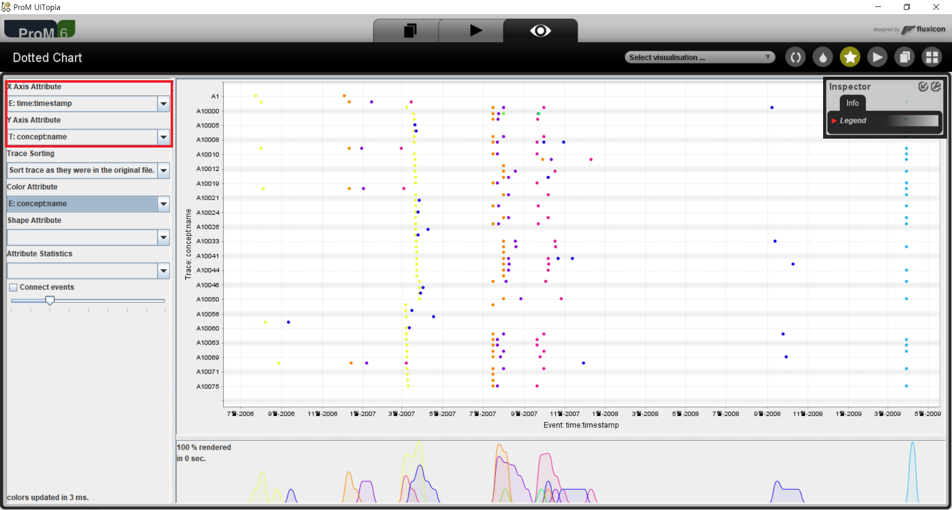 기본적으로 Dotted Chart는 X축이 timestamp (각 이벤트가 일어난 시각), Y축이 case id로 설정되어 있다. 이를 각자의 필요에 따라 바꿔준다. 이렇게 Dotted Chart를 도출할 수 있다.