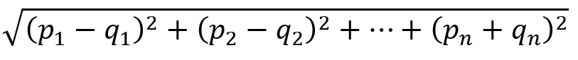 즉, 같은 dimension의 값을 뺀 것의 제곱의 합의 루트값이 Euclidean distance라고 할 수 있다. 이를 점 p = (p1, p2, ..., pn)와 점 q = (q1, q2, ..., qn) 사이의 거리를 표현한 일반적인 식으로 나타내면 다음과 같다.