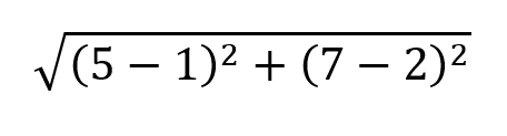 Euclidean distance는 우리가 일반적으로 생각하는 거리의 개념과 가장 비슷하다. 점 (1, 2), (5, 7)이 있다면 우리는 이 두 점 사이의 거리를 다음과 같은 식으로 계산한다.