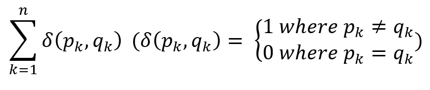 Hamming distance는 binary 문자열에서의 서로 다른 문자의 개수이다. 예를 들어, 11001라는 문자열이 있고 10111이라는 문자열이 있으면, 이들의 Hamming distance는 처음의 1과 마지막의 1이 일치하기 때문에 5 - 2 = 3으로 계산할 수 있다. 이를 점 p = (p1, p2, ..., pn)와 점 q = (q1, q2, ..., qn) 사이의 거리를 표현한 일반적인 식으로 나타내면 다음과 같다.