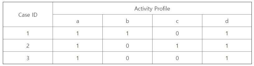 이를 프로세스 마이닝의 trace clustering에서 사용하는 profile 개념과 연결하여 설명해보겠다. 다음과 같은 activity profile을 가지는 case 3개가 있다고 하자.