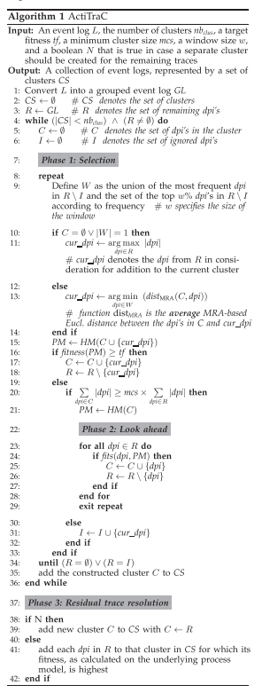 Active Trace Clustering의 알고리즘은 selection, look ahead, residual trace resolution의 세 단계로 이루어진다. 그 알고리즘은 다음과 같다. (알고리즘 내에서 dpi는 Distinct Process Instance, 즉 하나의 trace를 말한다.) 알고리즘을 시작하기 전에 우리는, 원하는 클러스터의 개수(nb_cluster), 목표 fitenss (tf), 최소 클러스터 크기 기준 (mcs), window size (w)를 미리 정한다.