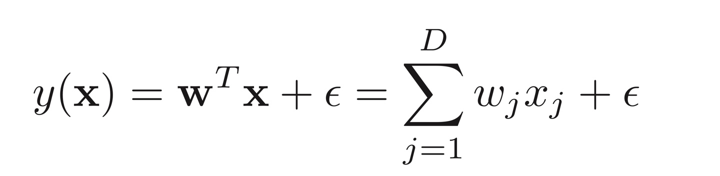 즉, 우리가 linear regression을 할 때는 epsilon을 가장 작게 하는 w^T값을 찾아, w^Tx값이 y(x) 값과 가장 가까워지도록 만드는 것을 목표로 하는 것이다. 이 식에서 우리는 x를 input vector, w를 weight vector, epsilon을 residual error라고 부른다.