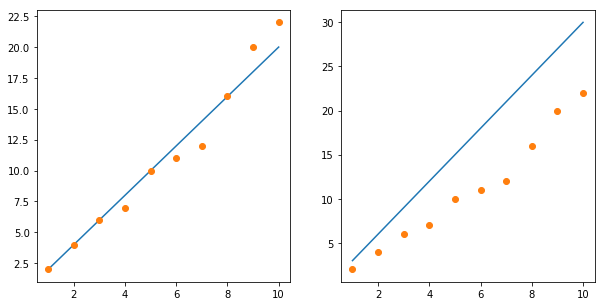 두 선 중 어떤 것이 데이터(점)를 더 정확하게 예측하는 것처럼 보이는가? 모두가 왼쪽이 더 정확하게 예측한다고 생각할 것이다. 왜 그렇게 생각했을까? 아마 각 x 점 (1, 2, ..., 10)에서의 y 값과 파란 선이 각 x점에서 가리키는 y 값이 겹치는 부분이 많고, 차이도 적게 나기 때문일 것이다. 이렇게 쉽게 말하면, 가장 데이터를 정확하게 예측하는 식을 찾는 과정을 우리는 linear regression이라고 한다.