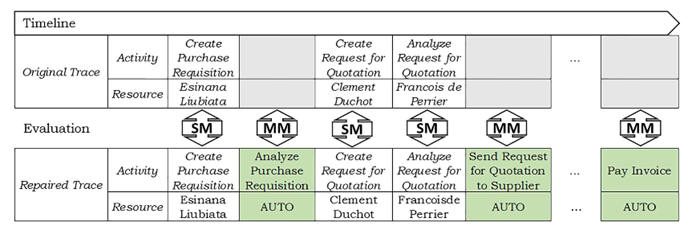- Replacement: 프로세스 모델에 fitting하지 않는 trace를 가장 비슷한 fitting trace로 대체한다.