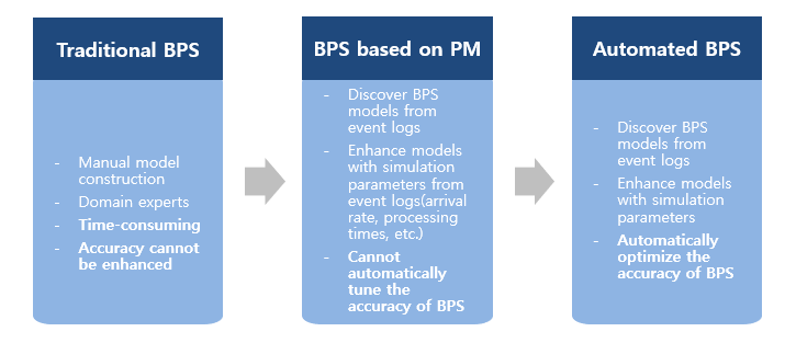 전통적인 BPS는 시뮬레이션 모델을 만들 때에 manual하게 작업을 진행했다. 즉, 전문가들이나 현업 종사자들을 인터뷰함으로써 그들의 생각에 맞는 프로세스 모델을 도출하고, 이를 기반으로 시뮬레이션을 한 것이다. 하지만 이러한 과정은 시간이 오래 걸리고, 현실을 반영한 정확한 모델을 도출할 수 없다는 단점을 가진다.