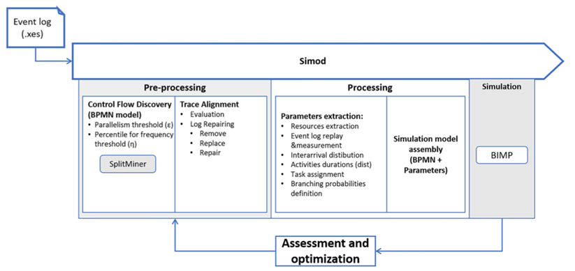 - Assessment and optimization: 도출된 이벤트 로그와 기존의 이벤트 로그를 비교하여 정확도를 평가하고, 시뮬레이션 파라미터를 튜닝하여 최적의 BPS 모델을 도출하는 과정.