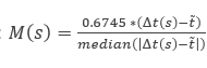 우선, 우리는 시간이 과하게 오래 걸리는 경우를 찾기 위해 각 segment들의 소요 시간의 중앙값을 찾는다. 이를 t tilde로 정의한다. 우리의 예시에서는 소요 시간이 10, 10, 12, 15, 15, 30이기 때문에 이것이 12가 될 것이다. 그 후에 아래 식에 따라 modified z-score 값을 계산한다.