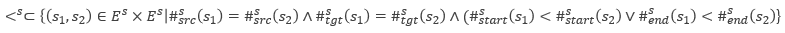 segement-level event log는 directly related되어 있는 case-level event의 pair로 이루어진다. 즉, 하나의 케이스 안에 속해 있는 바로 연속한 두 이벤트 쌍을 말한다. segment-level event는 case id, source activity, target activity, start time, end time으로 이루어져 있으며, start time은 source activity가 일어난 시각, end time은 tartet activity가 일어난 시각을 말한다. 이 이벤트의 순서는 source activity와 target activity가 같을 때 start time 혹은 end time 중 하나의 기준의 순서에 의해 결정된다. 이를 수학적으로 나타내면 다음과 같다.