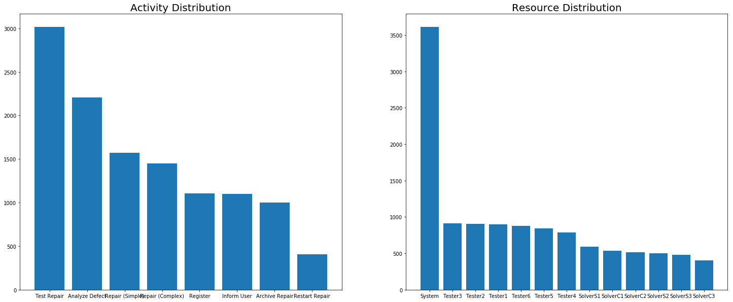 이 단계에서는 이벤트 로그의 액티비티와 resource 분포를 분석한다. 여기에서 좀 더 나아가 가장 빈도가 높은 작업(액티비티)이 무엇인지, 가장 일을 많이 하는 작업자(resource)가 누구인지 등을 도출할 수 있지만 tutorial이기 때문에 해당 심층 분석은 추후 포스팅에서 진행한다.