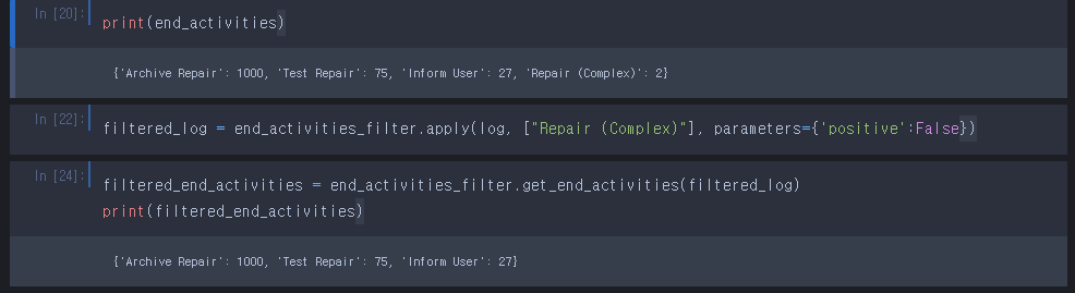 프로세스 마이닝 분석에서 필요하지 않은 데이터를 제거하는 필터링은 필수적이다. 이 단계에서는 프로세스 마이닝의 필터링을 진행해본다. (작업시간 / 시작시각 등 다양한 필터링 기준이 존재하지만, 튜토리얼이기 때문에 종료 작업으로 하는 필터링만을 진행한다.)