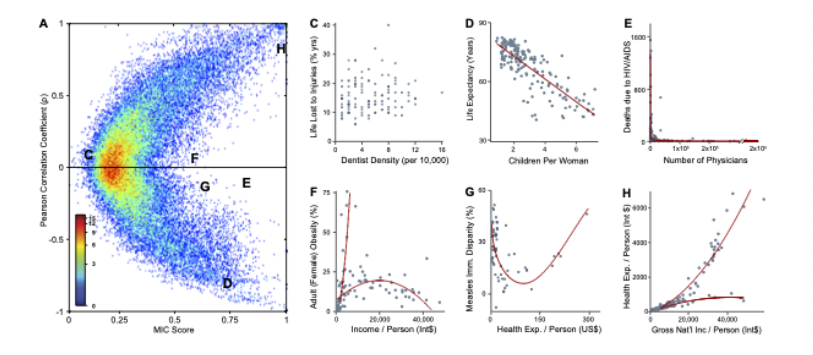 위 그림을 살펴보면, MIC와 correlation이 모두 낮은 C 그림에서는 데이터 안에서 아무런 관계가 없음을, MIC와 correlation이 모두 높은 D, H 그림에서는 linear relationship을, correlation이 낮고 MIC가 높은 E, F, G 그림에서는 correlation이 발견하지 못하는 non-linear relationship을 MIC는 잘 캐치했음을 알 수 있다.