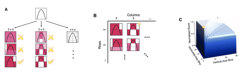 X, Y 값이 주어져있는데 분포를 알 수 없을 때 우리는 히스토그램을 그려서 해당 분포를 추정하는 방법을 사용한다. 이와 비슷한 형태로, 우리는 X, Y 값을 discretize하여 각 값을 하나의 bin 안으로 매핑하고, 이를 이용하여 MI를 계산한다. Maxmial Information Coefficient는 다음과 같이 정의할 수 있다.