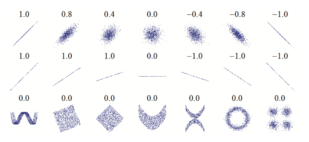 서로 다른 두 random variable의 관계를 알고 싶다면, 가장 먼저 우리는 correlation을 계산해볼 수 있을 것이다. 하지만 correlation은 모든 random variable이 real-value인 값을 가지고 있을 때에만 계산할 수 있다는 한계점을 지닌다. 또한 correlation은 두 변수의 dependence를 아주 정확하게는 계산하지 못한다는 단점을 가진다. 아래 그림을 살펴보자.