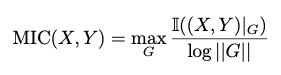 위 식에서 G는 X와 Y 값을 각 bin으로 나눈 2d grid, (X,Y)|G는 각 X,Y 값이 이 grid에 들어간 분포, 그리고 ||G||는 X 방향 grid의 개수와 Y 방향 grid의 개수 중 최솟값을 말한다. log||G||로 값을 normalization 함으로써 MIC 값이 0과 1 사이로 제한되게 된다.