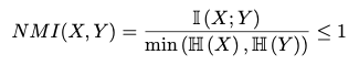 그러므로 MI 값은 H(X)와 H(Y) 값보다 작고, 이를 달리 말하면 H(X)와 H(Y)의 최솟값보다 MI 값이 작다고 할 수 있을 것이다. 그러므로 우리는, normalized mutual information을 아래와 같이 정의할 수 있다.