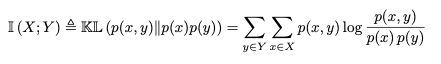 이 때, X와 Y가 inpdependent하다면 p(x,y)가 p(x)p(y)와 같아지기 때문에 log 내 식 값이 1이 되고, MI 값은 0이 될 것이다. 그러므로 X, Y가 dependent할수록 MI 값이 커진다고 할 수 있다. 이 때, X와 Y의 순서를 바꾸어도 MI 값은 같다.