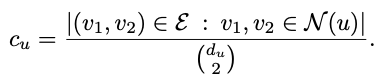 위 식에서 d_u는 노드 u의 degree를 뜻하고, N(u)는 노드 u의 이웃 노드를 뜻한다. 그러므로 분모는 노드 u의 이웃 노드들끼리의 노드쌍의 경우의 수를 의미하고, 분자는 그 중 연결된 엣지의 수를 의미한다. 즉, clustering coefficient가 1이면 모든 이웃 노드들이 서로 연결되어 있는 것이고, clustering coefficient가 0이면 모든 이웃 노드들이 서로 연결되어 있지 않은 것이다.