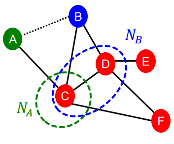 그림에도 나타나 있듯이, 노드 A의 neighborhood는 C이고, 노드 B의 neighborhood는 B이다. 그러므로 노드 A와 B의 common neighbors는 1이다.
