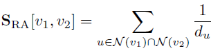 위의 세 개 measure들은 노드들이 공유하는 이웃 노드를 노드의 degree에 의해 왜곡되지 않도록 normalize했다는 공통점이 있다. 하지만 이를 넘어 노드들이 공유하는 이웃 노드의 중요도를 measure에 반영할 수도 있다. 그 첫번째 예시가 RA index이다. RA index는 다음과 같이 정의한다.