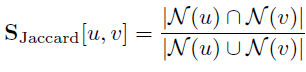 Jaccard overlap은 두 노드가 공유하는 노드의 개수를 두 노드의 이웃 노드의 합집합의 개수로 나눈다. 위 예시 그래프에서 이를 구하면 1/2=0.5가 된다.