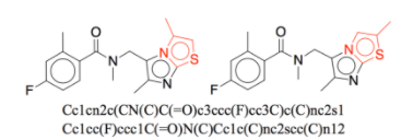 SMILES 표기법의 첫 번째 단점은 분자 간의 유사도를 표현할 수 없다는 점이다. 서로 분자 구조가 아주 비슷한 분자들이라도 SMILES 표기법으로 표현하면 서로 아주 다른 string으로 표현될 수 있는 것이다. 아래 예시에서 볼 수 있듯이, 두 개의 아주 비슷한 구조를 가진 분자가 SMILES로 표현하면 아주 다른 형태로 표현된다.