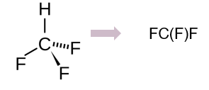 분자의 가지는 괄호()로 표현한다. 이 때, 괄호 안에 포함된 첫 번째 원자와 괄호가 끝나고 나오는 첫 번째 원자가 같은 원자에 연결되어 있다. 예를 들어, fluoroform 분자는 아래와 같이 표현할 수 있다. 즉, 괄호 안에 포함된 첫 번째 원자인 F와, 그 다음에 나오는 F가 C라는 같은 원자에 연결되어 있는 것이다.