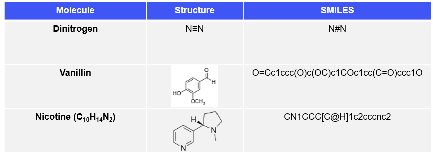 SMILES 표기법의 대표적인 장점은 string 형태로 표현되기 때문에, string 형태에 적용시킬 수 있는 다양한 머신러닝/딥러닝 알고리즘을 활용할 수 있다는 점이다. NLP에 활용되는 다양한 알고리즘들을 원자는 단어, SMILES는 문장으로 생각하고 적용할 수 있다. 예시로, word2vec을 SMILES에 사용하여 해당 분자의 feature를 표현하거나, VAE, GAN 등 다양한 generative model을 분자 생성에 활용할 수 있는 것이다.