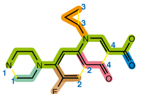 이 분자의 한 부분의 결합을 아래와 같이 끊으면, O 분자로부터 반시계방향으로 돌아가면서 SMILES 표기법으로 분자를 표현할 수 있다. 이 때, 해당 고리의 번호는 1이다.