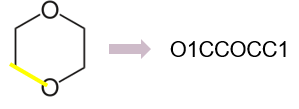 SMILES 표기법에서 고리는 어떤 랜덤한 한 지점의 결합을 끊고, 해당 끊긴 부분의 원자 두 개에 번호를 표시하는 방식으로 표기한다. 예를 들어, 다음과 같은 dioxane 분자가 있다고 하자.