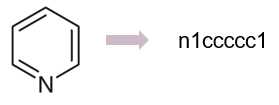 방향족은 탄소 화합물이 평면의 고리 형태로 결합하여 안정적인 구조를 가지는 aromatic ring을 포함하고 있는 것을 말한다. 이 aromatic ring은 위에 설명한 고리 (ring)을 표현하는 것과 동일하게 표시하지만, 여기에 포함된 B, C, N, O, P, S 원자를 소문자로 표시한다. 이 예시가 되는 피리딘 분자는 아래와 같이 표현할 수 있다.