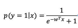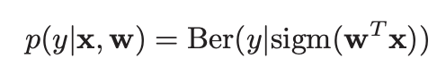 위 식에서 Ber은 Bernouii distribution, sigm은 sigmoid 함수 (다른 이름으로, logistic 함수)를 의미한다. 즉, 이를 다시 쓰면 아래 식과 같다. 즉, 우리는 주어진 x에 대해서 y를 잘 예측하는 w 값을 구하는 것을 목표로 하는 것이다.