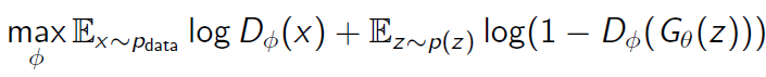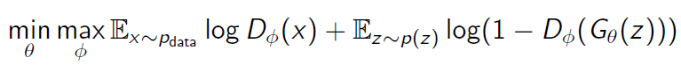 GAN의 간략한 구조를 이해했다면, 이제 GAN의 구조를 수식을 통해서 알아보도록 하겠다. 우선 우리의 generator를 $G$, 그것의 parameter를 $\theta$, discriminator를 $D$, 그것의 parameter를 $\phi$라고 하자. 또한 1을 실제 데이터, 0을 가짜 데이터를 나타내는 label이라고 하자. 그러면 우리는 GAN이 학습되는 과정에서의 objective function을 아래 식과 같이 표현할 수 있다.