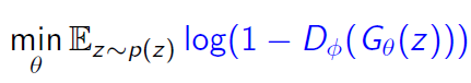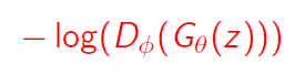 위 그래프를 보면, $log (1-D)$는 $D(G(z))$가 0에 가까울 때, gradient가 0에 가깝기 때문에 학습이 잘 되지 않을 수 있다. 그렇기 때문에 우리는, 위의 generator objective function 대신에 다음 objective function을 학습에 활용한다.