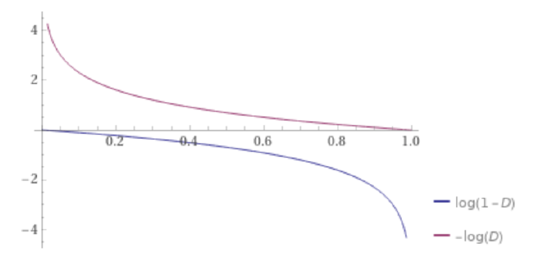 하지만 위 objective function을 활용해서 GAN을 학습하면 실제로는 학습이 잘 되지 않는 경우가 있다. 그 이유는, generator의 성능이 안 좋을 때, 해당 objective function을 따르면 gradient가 굉장히 작아서 학습이 빠르게 될 수 없기 때문이다. 다음 그래프를 보자.