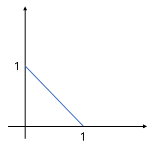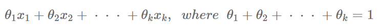 예를 들어, $x_1=(0,1)$, $x_2=(1,0)$이라고 하자. 그럼 이 두 점의 모든 affine combination은 다음과 같이, $(1,0)$과 $(0,1)$을 지나는 선분 형태로 표현할 수 있을 것이다. 즉, convex combination은 점들 간의 선분 위에 항상 위치한다.