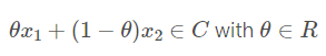 다음으로, convex set은 다음과 같이 정의할 수 있다. 두 점 $x_1$, $x_2$가 집합 $C$ 안에 속해 있을 때, 두 점을 잇는 선분 위에 있는 모든 점이 집합 $C$ 안에 항상 포함된다면, 이 집합 $C$는 convex set이라고 할 수 있는 것이다.