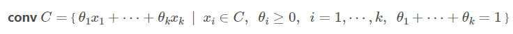 마지막으로, convex hull은 어떤 집합 $C$의 모든 convex combination의 집합을 말하고, 다음과 같이 정의할 수 있다. Convex hull은 항상 convex set이고, 집합 $C$를 포함하는 가장 작은 convex set이다.