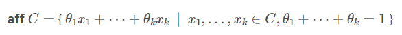 마지막으로, affine hull은 어떤 집합 $C$의 모든 affine combination의 집합을 말한다. 이는 다음과 같이 정의할 수 있다.